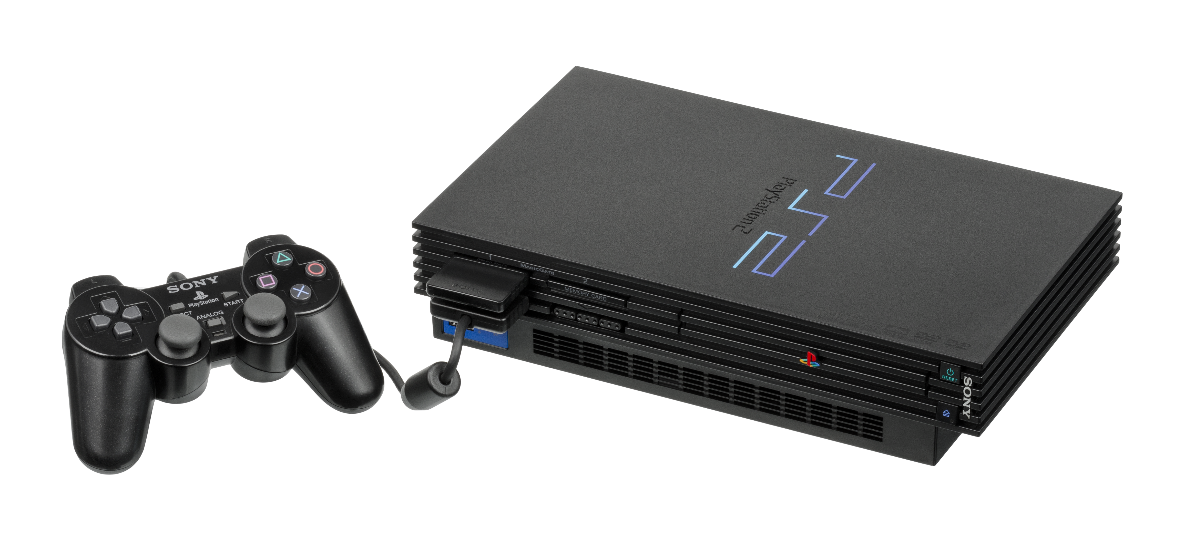 The Sony PlayStation 2 (PS2) video game console, shown with Dualshock 2 controller and 8MB memory card plugged in. First released in 2000, it is a sixth generation console and the follow up to the hugely successful PlayStation console. The system would. Photo Credit: Wikimedia Commons @Evan-Amos