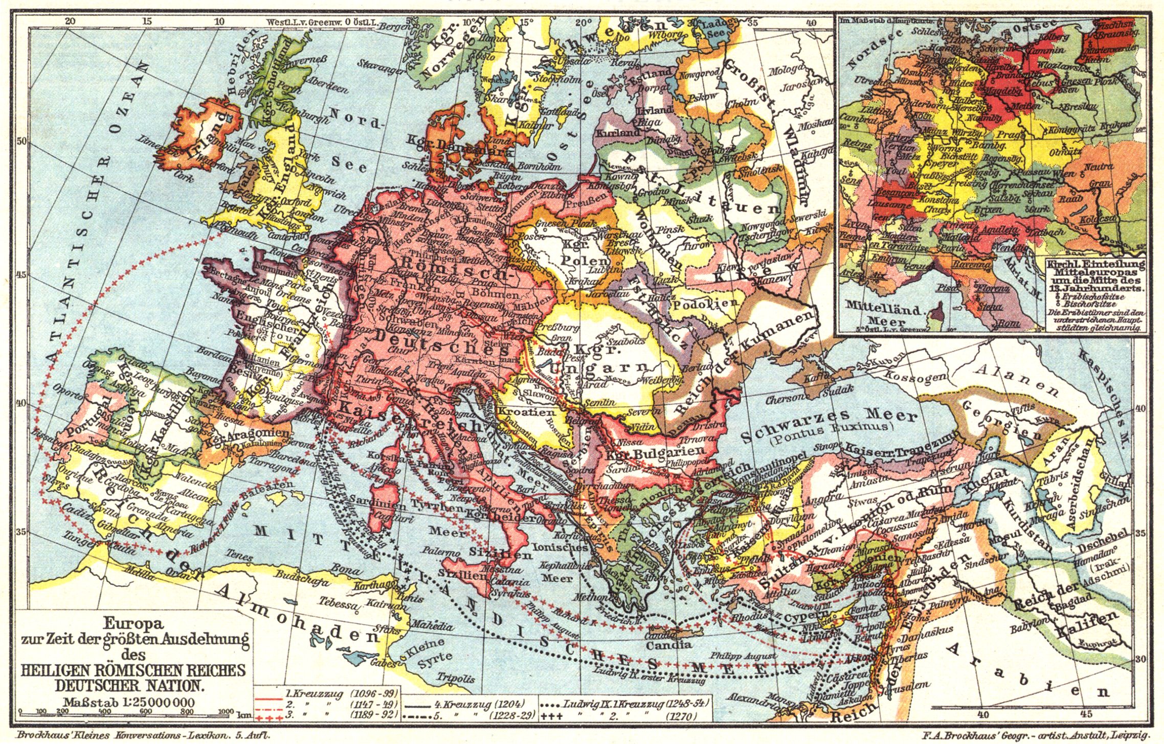 The Holy Roman Empire (of the German Nation) at its greatest territorial extent. Photo Credit: Wikimedia Commons @F.A. Brockhaus' Geogr.-artist. Anstalt, Leipzig. (Brockhaus Kleines Konversations-Lexikon Fünfte Auflage von 1911