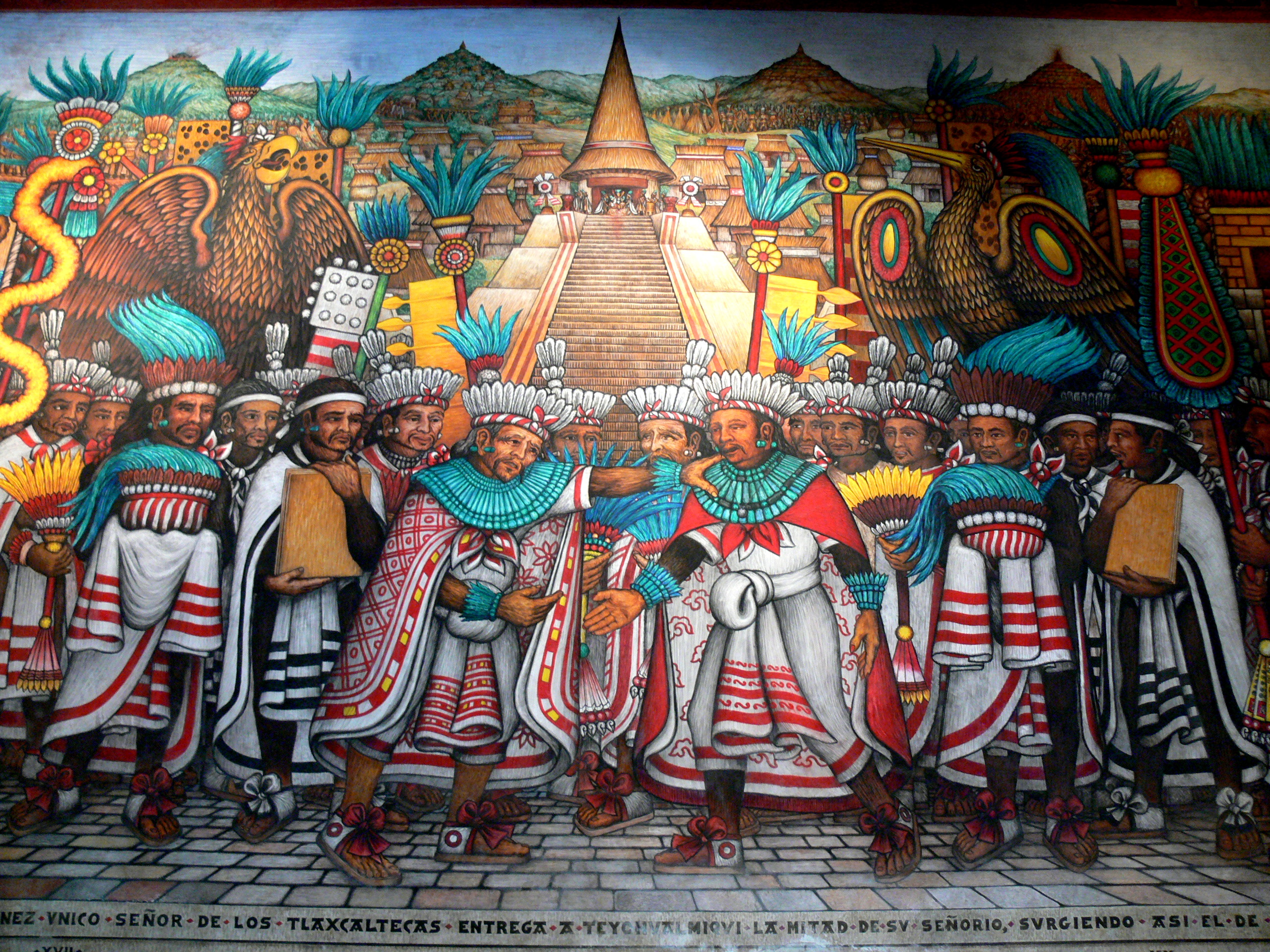 Tlaxcala city. Palacio de Gobierno: Murals - Encounter of Indian princes in Tlaxcala. Photo Credit: Wikimedia Commons @Wolfgang Sauber