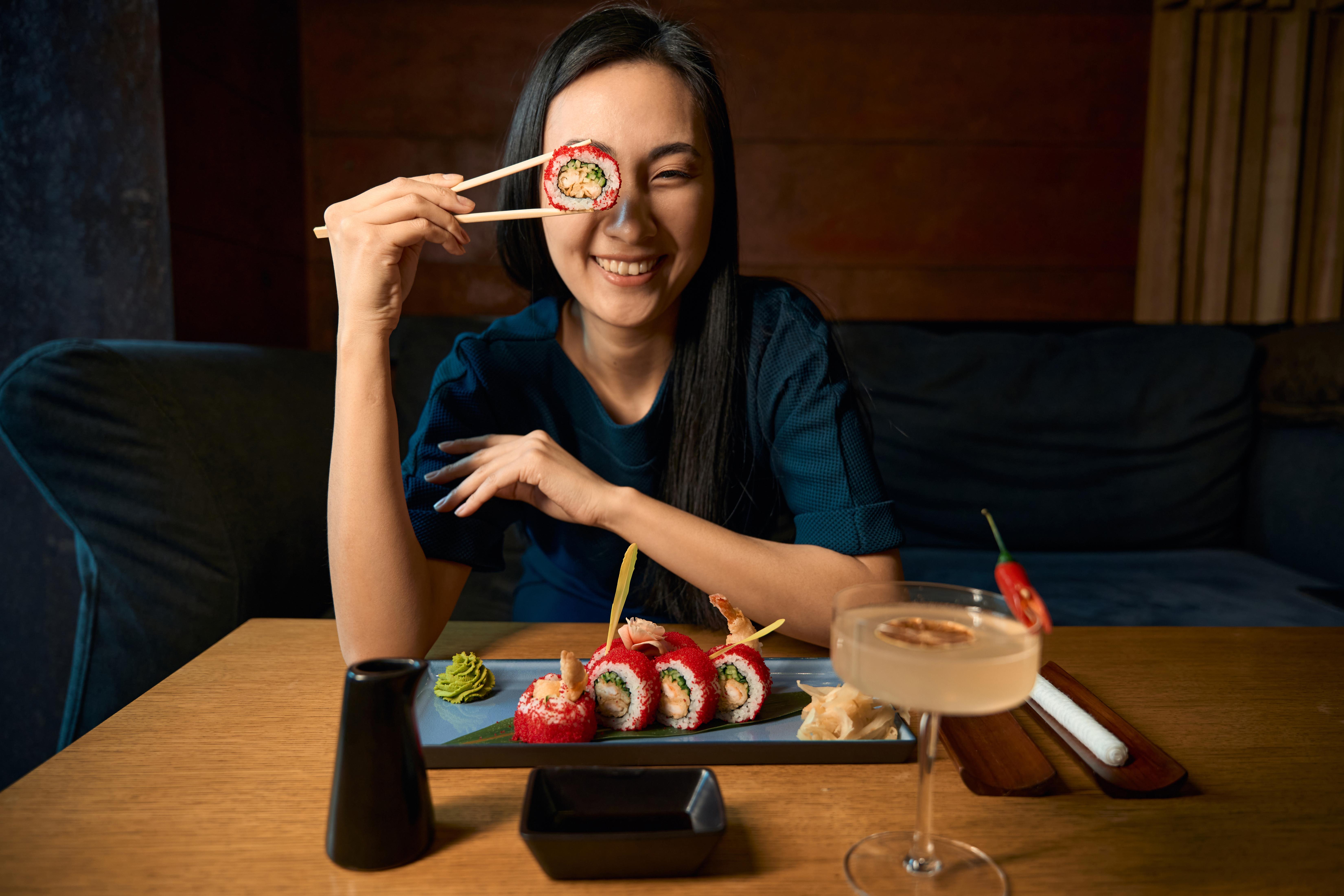 Asian woman having fun drinking cocktail and holding sushi near eye. Photo Credit: Envato @Iakobchuk
