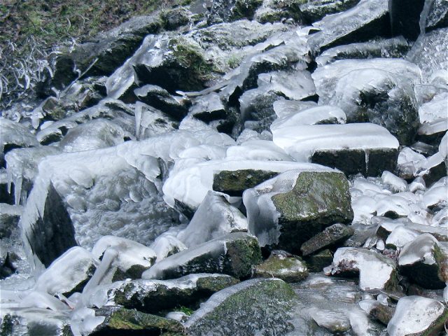 Ice formations at Melin Court Falls The spray from the falls is gathering on these nearby stones in a quite interesting way. Photo Credit: Wikimedia Commons @Nigel Davies