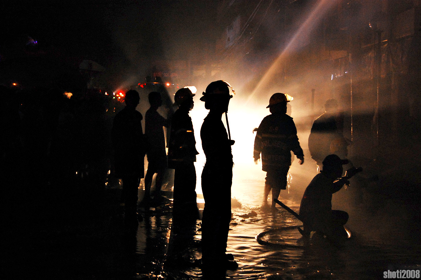 500px provided description: local firemen desperately looking for solutions to disrupt a fire raging in a shop selling tires. [#fire ,#Manila ,#Philippines. Photo Credit: Wikimedia Commons @DarwIn
