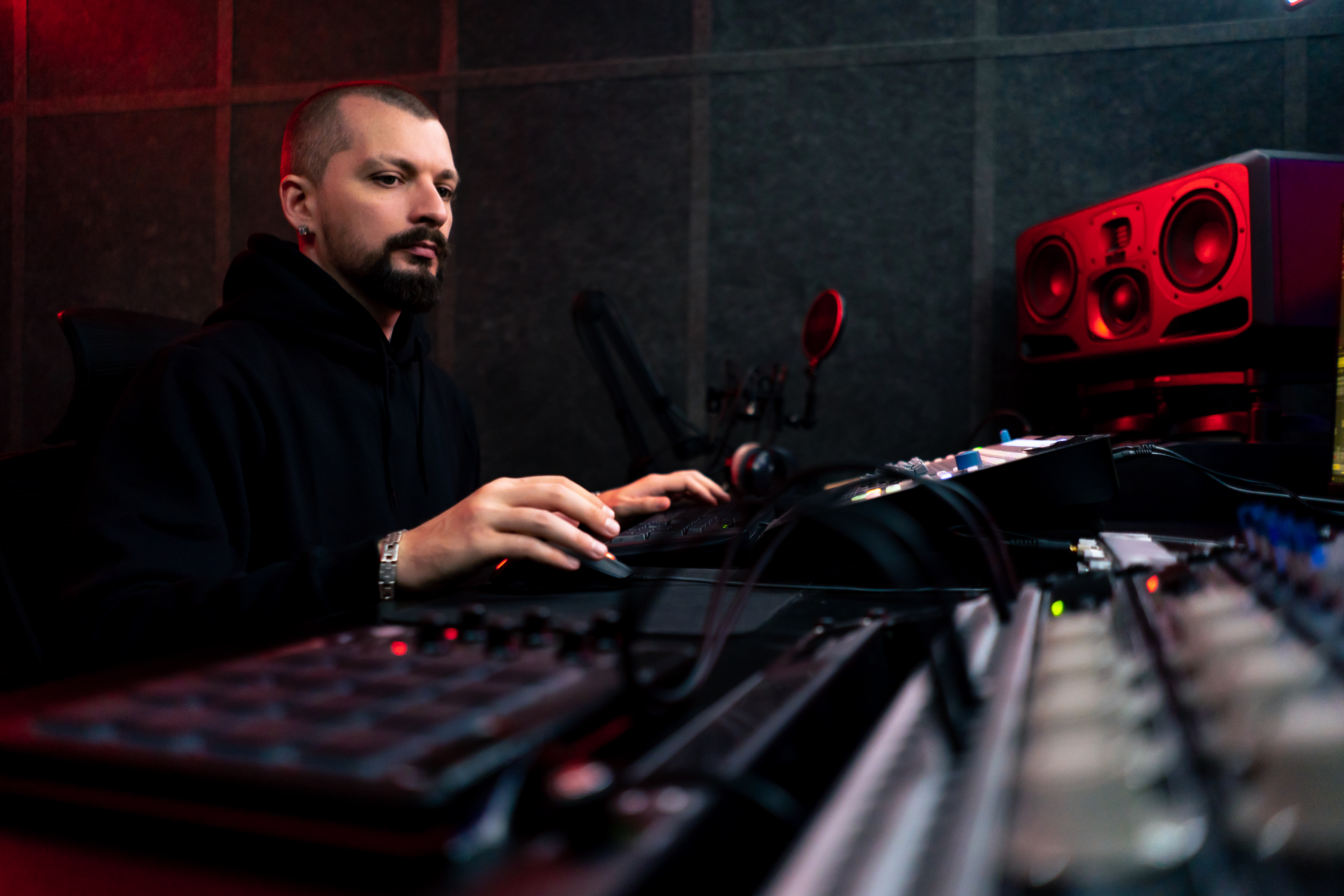 in the recording room dark with neon lighting in the studio, the sound engineer works at the console. Photo Credit: Envato @guyswhoshoot