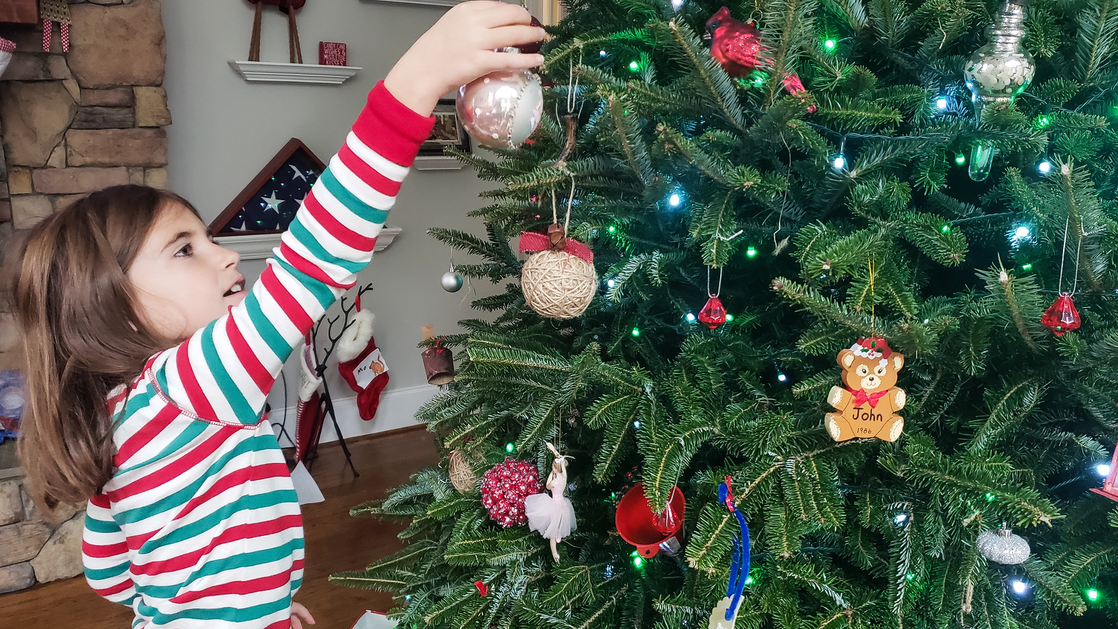 Generation z kid hanging a Christmas ornament on decorated tree in memories and emotions. Photo Credit: Envato @Beachbumledford