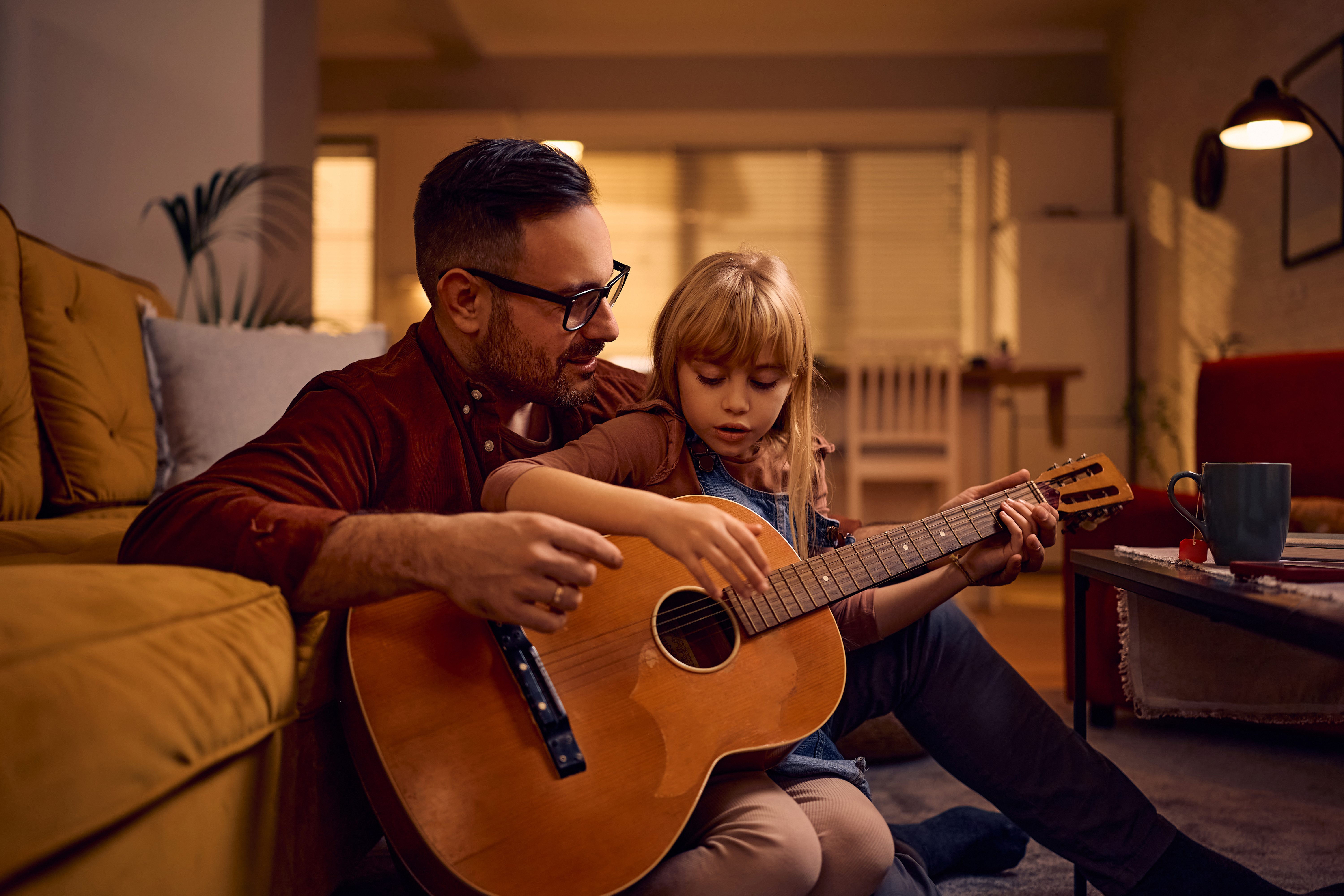 Father and daughter playing acoustic guitar at home. Photo Credit: Envato @drazenphoto