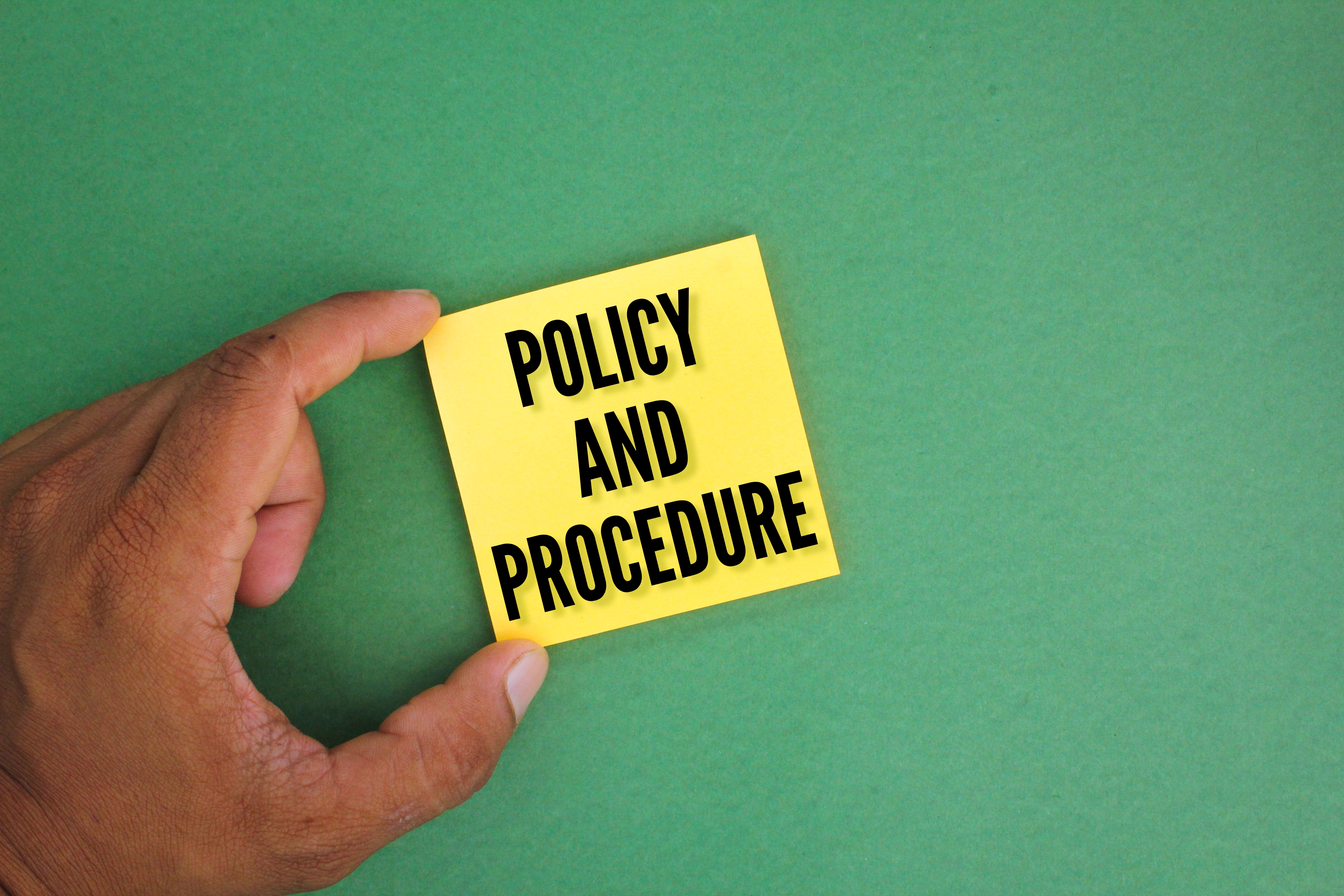 hand holding colored paper with the words policy and procedure. Photo Credit: Envato @fauziEv8