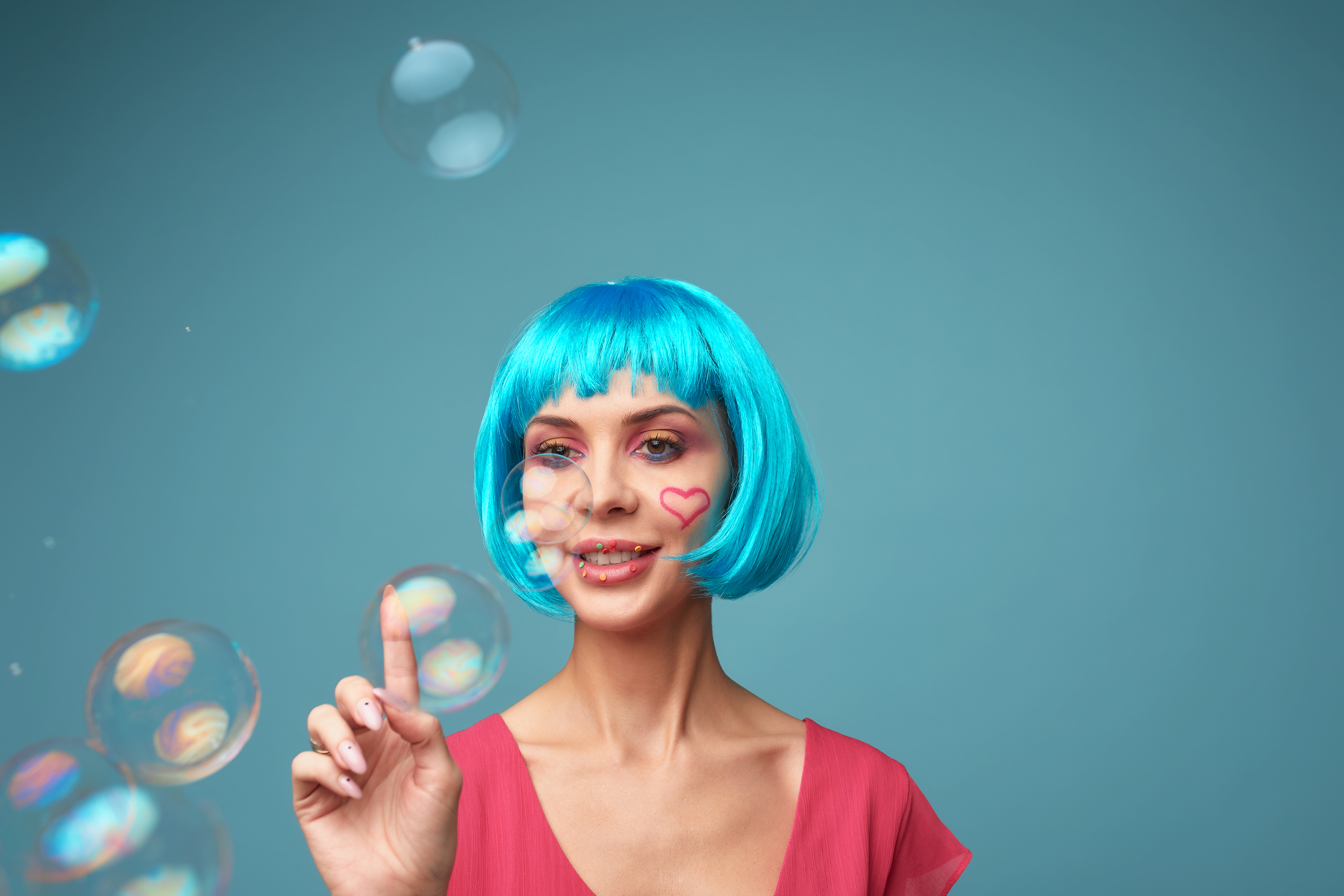 Beautiful young woman with blue wig and bright make-up in soap bubbles. Fashion model girl with. Photo Credit: Envato @Gerain0812