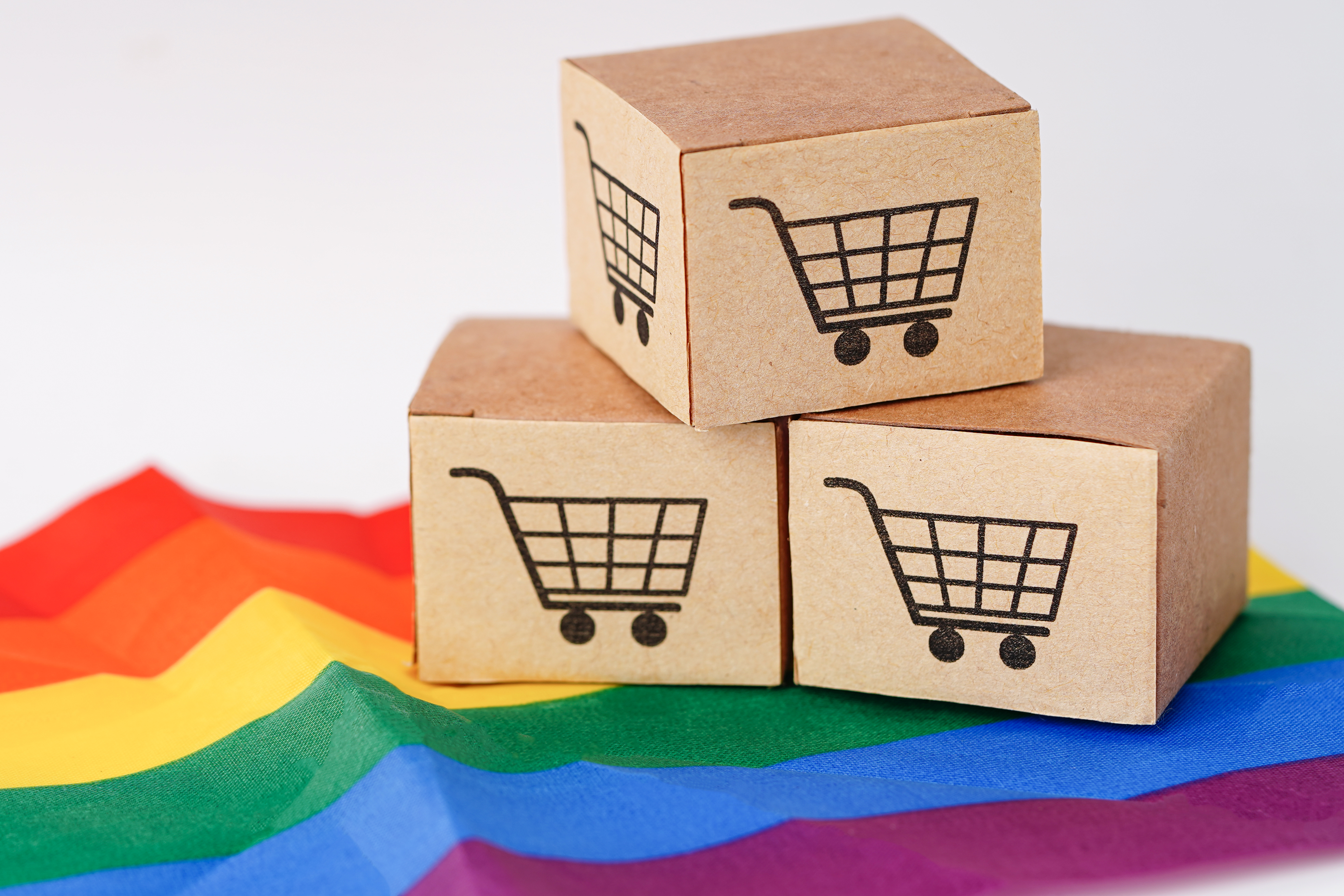 Box with shopping cart logo and LGBT flag. Photo Credit: Envato @chormail