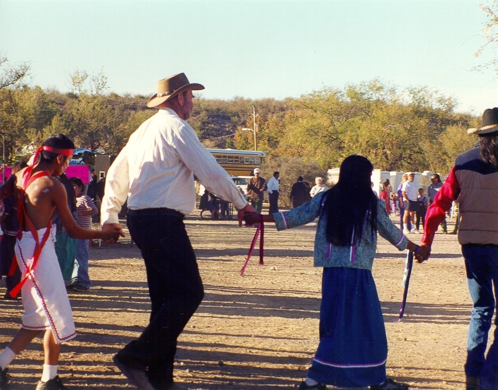 children and adults clasp hands for circle dance. Photo Credit: Wikimedia Commons @BMacZeroBot