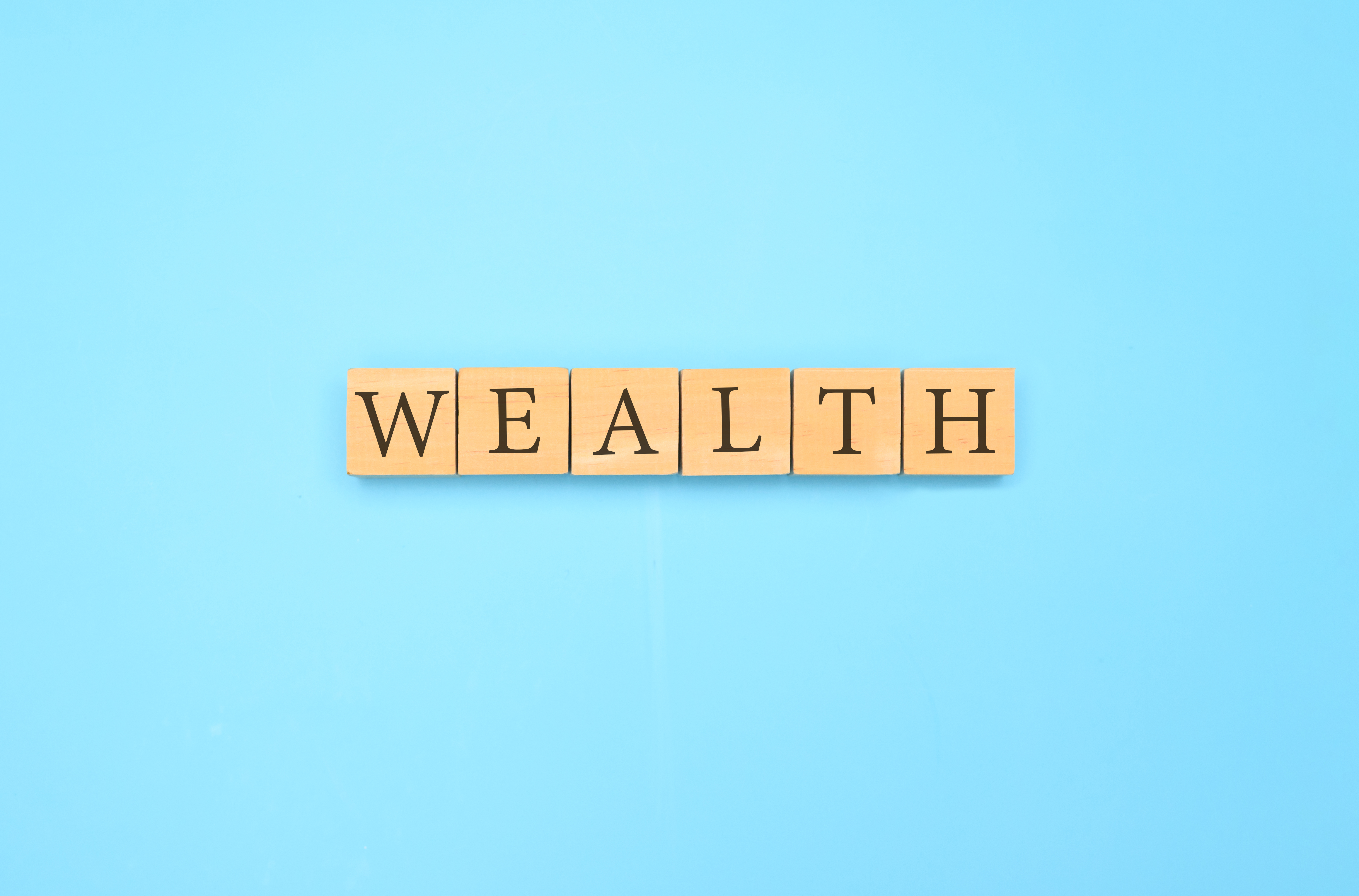Wealth text written on wooden block with abstract blue background. Photo Credit: Envato @1footage