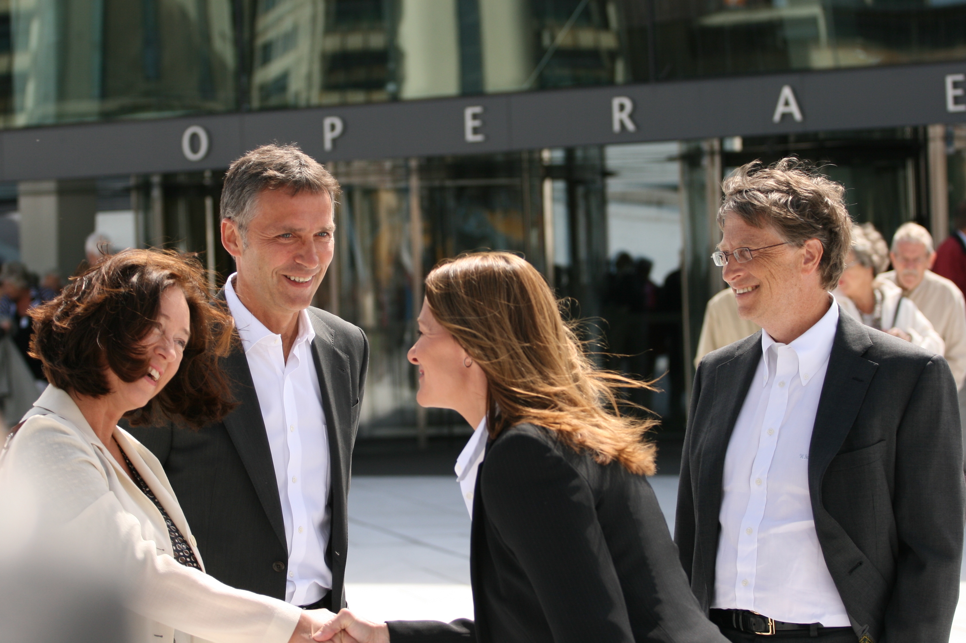 Bill and Melinda Gates meet Norwegian PM Jens Stoltenberg and wife Ingrid Schulerud during their visit to the Oslo Opera House in June 2009. Photo Credit: Wikimedia Commons @Kjetil Ree