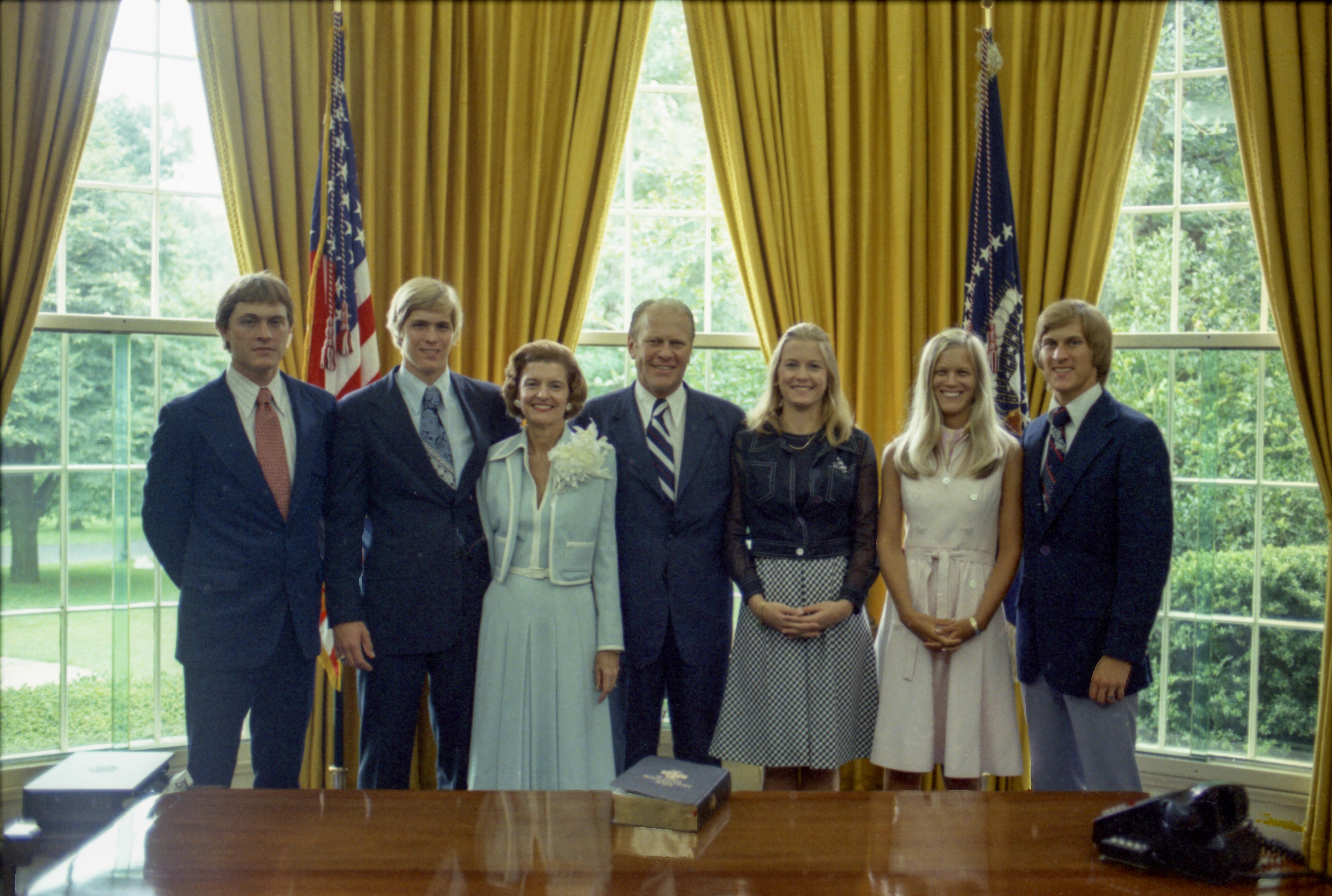 The Ford Family in the Oval Office prior to the swearing-in of Gerald R. Ford as President. August 9, 1974. (left to right) Jack, Steve, Betty, President Ford, Susan, Gayle (wife of Mike), and Mike.Français : Famille Ford dans le bureau ovale de. Photo Credit: Wikimedia Commons @White House